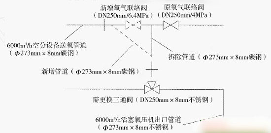 (1)將原DN250mm氧氣專用截止閥作為一段管道使用,閥門常年處于開啟狀態(tài);并緊固兩側(cè)法蘭,確保法蘭連接處不泄漏氧氣。在管道上重新加裝一個壓力為614MPa的DN250mm氧氣專用截止閥,將此閥門作為平時操作用切斷閥(中間聯(lián)絡(luò)閥)。