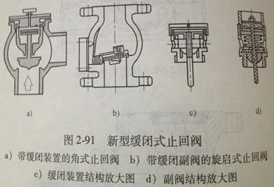 在某些特殊情況下,如管路壓力經(jīng)常發(fā)生變化,或有特殊要求時(shí),在旋啟式止回閥或升降式止回閥上設(shè)置緩沖裝置,形成緩閉式止回閥。圖2-91a所示是帶緩閉式裝置的角式升降式止回閥。這種閥使用于介質(zhì)倒流十分迅速的系統(tǒng),它能打打減小水擊壓力。圖2-91b是一種帶緩閉副閥的旋啟式止回閥。圖2-91c是圖2-91a中緩閉式裝置的放大圖。圖2-91d是副閥機(jī)構(gòu)放大圖。在這種新型緩閉式止回閥中,主閥的快速關(guān)閉相當(dāng)于 常規(guī)緩閉式止回閥的快關(guān)階段,而副閥的緩閉式慢關(guān)閉則相當(dāng)于常規(guī)緩閉式的慢關(guān)階段,因此,這種止回閥能有效地防止水擊。