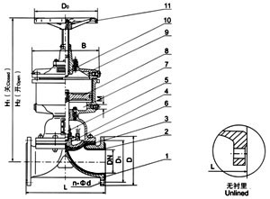 部件列表: 1、閥體 2、閥體襯里 3、隔膜 4、閥瓣 5、下閥桿 6、閥蓋 7、氣缸 8、活塞 9、氣缸蓋 10、上閥桿 11、手輪