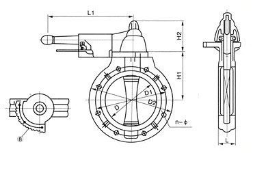 注:1.本蝶閥系列法蘭孔徑按GB2555-81,1.0Mpa標(biāo)準(zhǔn)。也可按用戶要求按JIS,DIN,ANSI標(biāo)準(zhǔn)進(jìn)行制作。